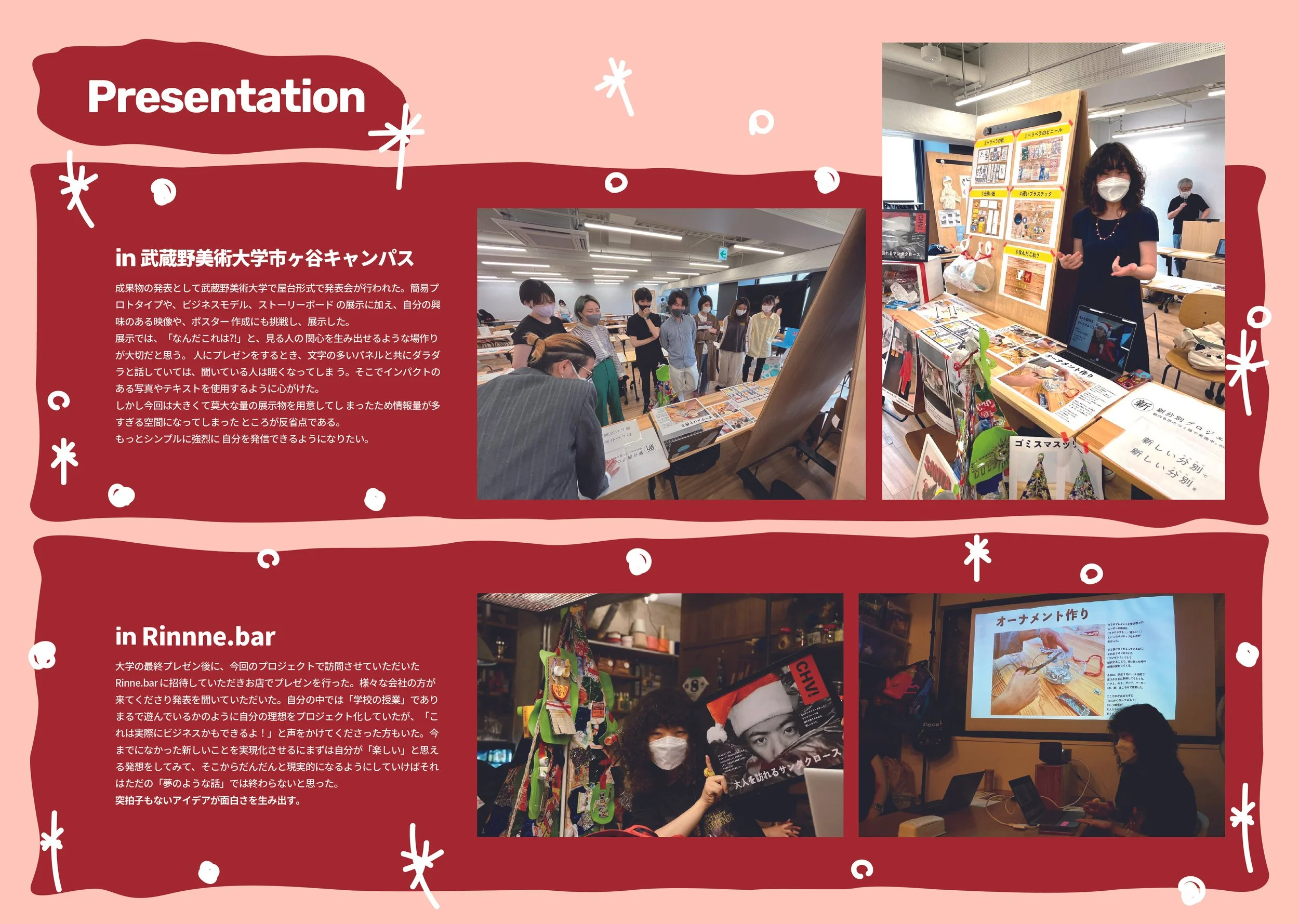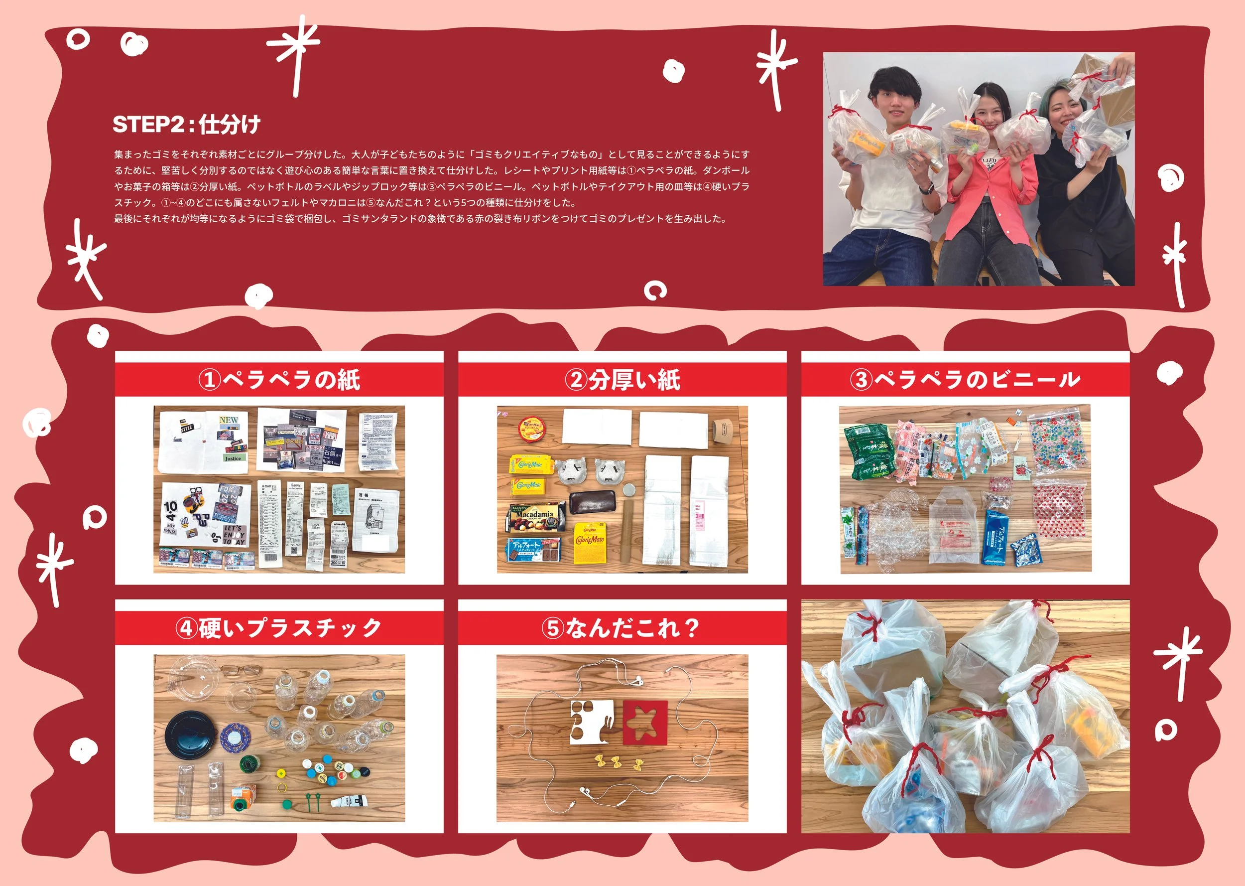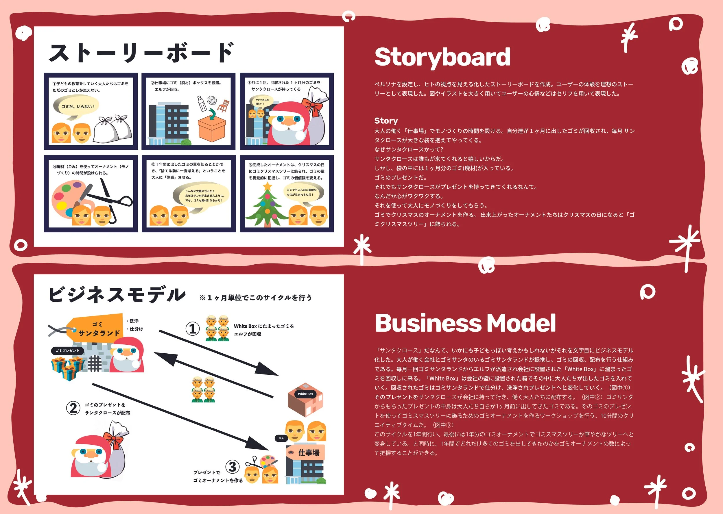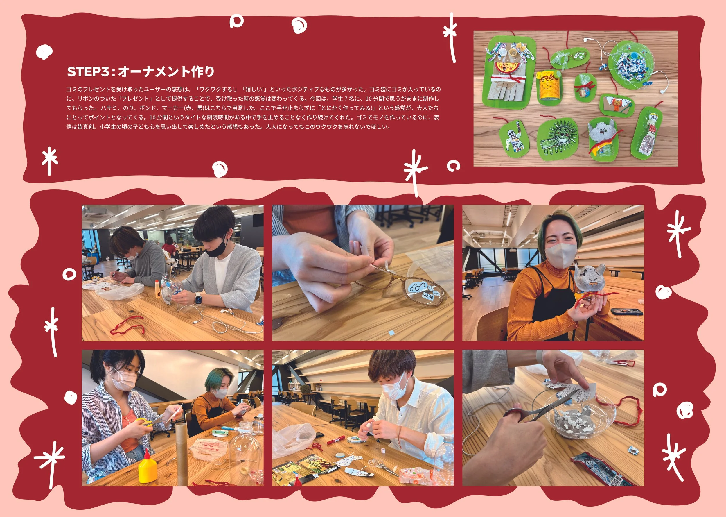 大人のゴミに対する価値観を変えて、クリエイティブの場を与えるためのサービス。自分たちで出したゴミをプレゼントとして持ってくるサンタクロースが仕事場にやって来る。大人たちはそのゴミを使ってゴミスマスツリー用のオーナメントを作る。